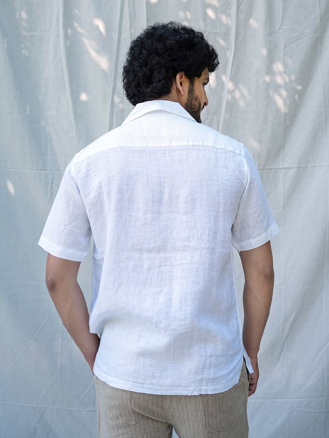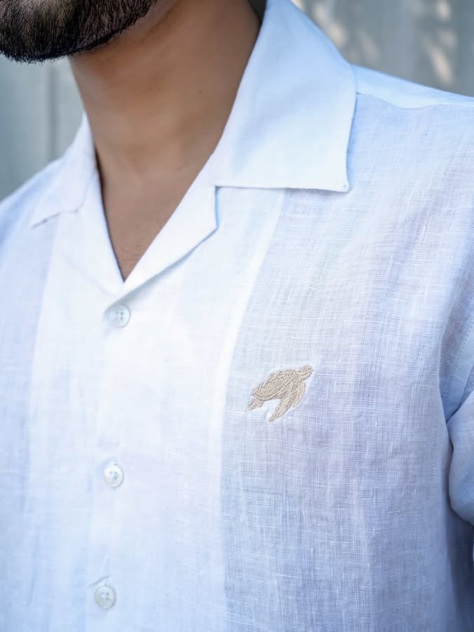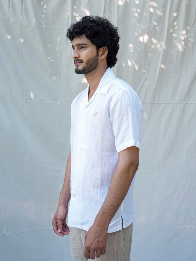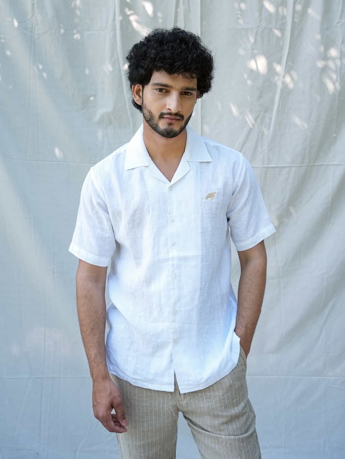 A testament to Mangrove’s Refined Craftsmanship, This Pearl White Cuban Collar Shirt is a perfect blend of Effortless Style and Everyday Comfort. Made from 60 Lea Premium Linen, it offers Breathability, Softness, and Temperature regulation, making it ideal for warm-weather dressing. The Relaxed Half-Sleeves and Open Cuban Collar add a touch of laid-back Sophistication. The Contrast Tan Embroidered KURMA emblem on the chest completes the look with subtle elegance.